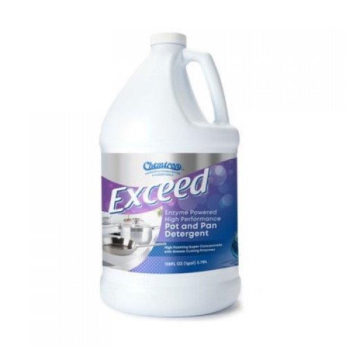 Premium consumer Pot and Pan Detergent with excellent grease cutting ability and long lasting suds. Exceed is a high performance super concentrate pot and pan detergent. Contains grease cutting enzymes